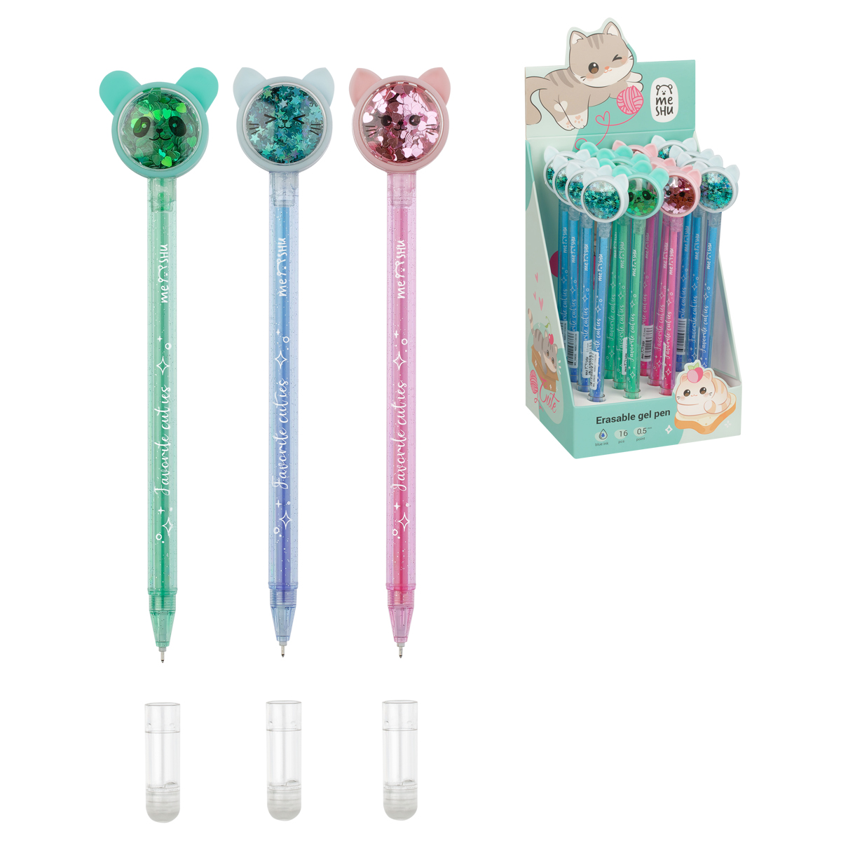 362466 Ручка гелевая стираемая автоматическая MESHU "Cool cats" синяя, 0,5мм, корпус ассорти, с топпером