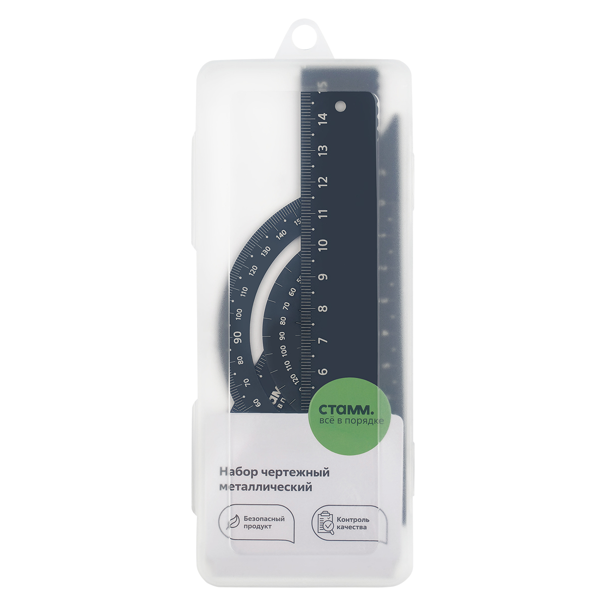 364747 Набор чертежный СТАММ, размер S (линейка 15см, треугольник, транспортир), металлический, черный, в пенале