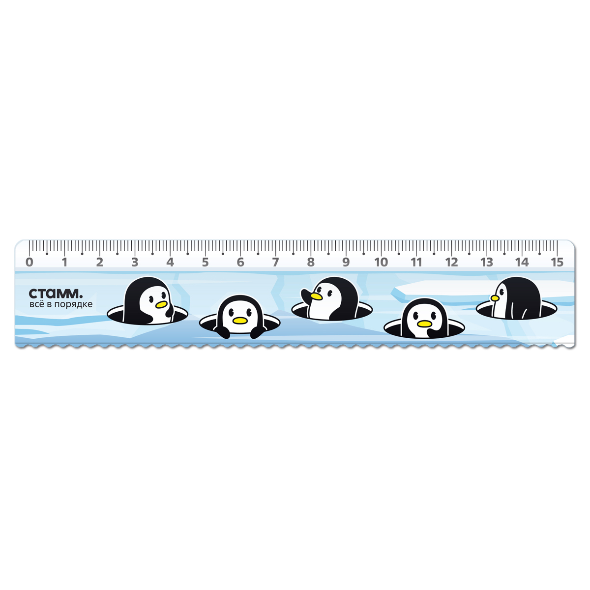 366429 Линейка 15см СТАММ "Пингвины", пластиковая, с волнистым краем, европодвес