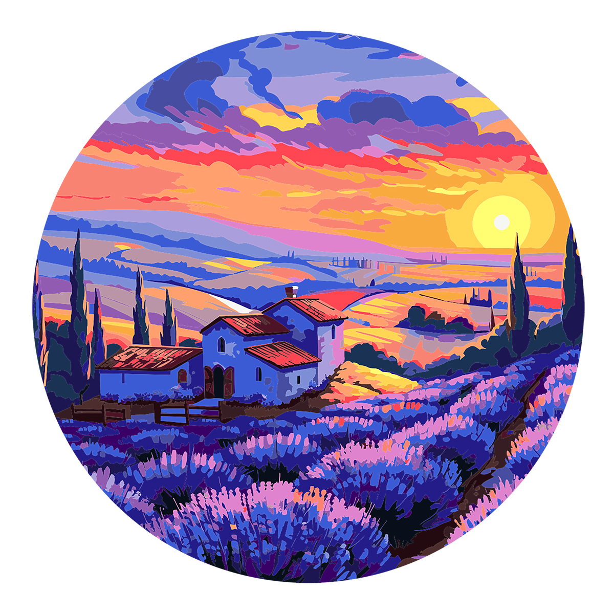 374434 Картина по номерам на фигурном холсте ТРИ СОВЫ "Лавандовый закат", форма круг, с акриловыми красками и кистями