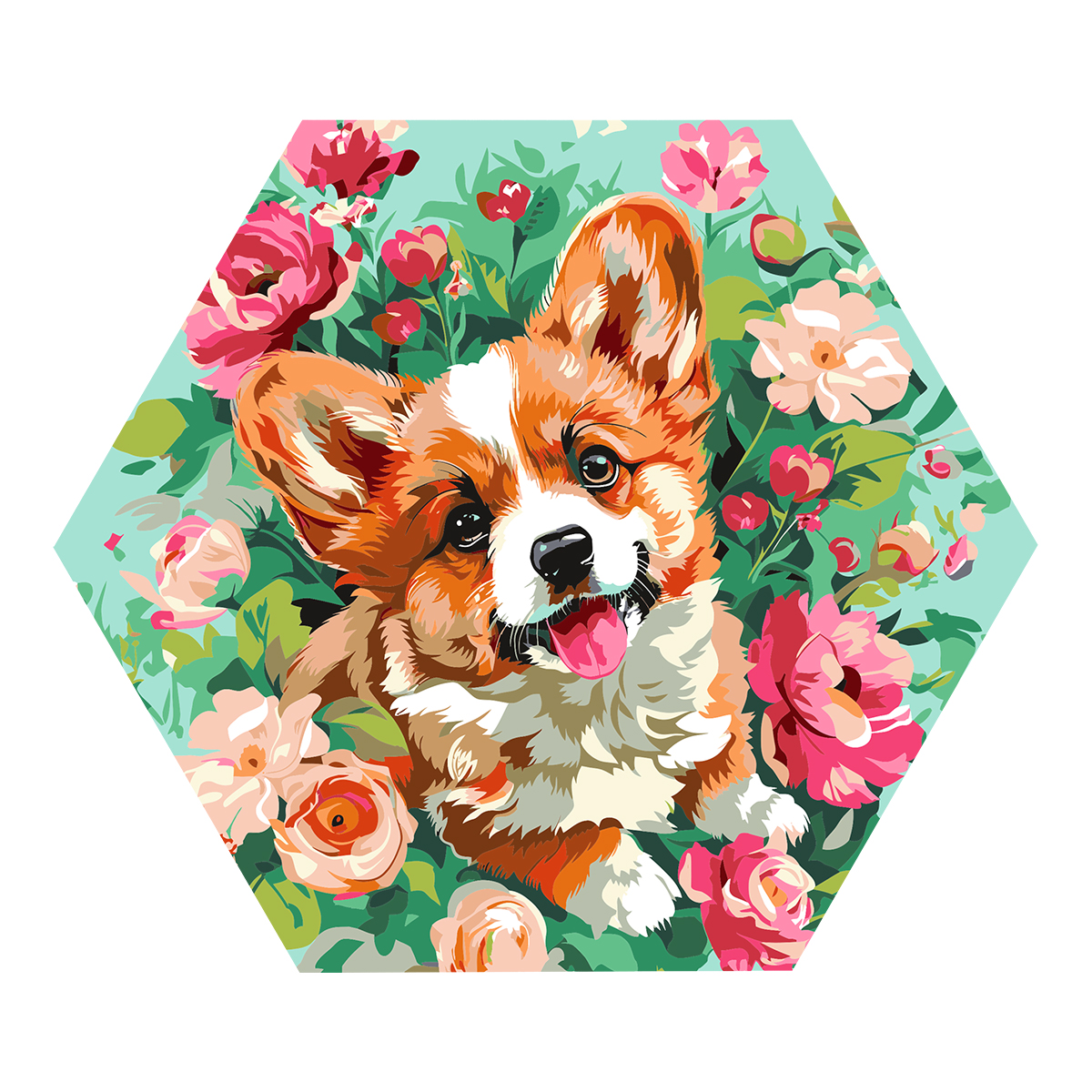 374437 Картина по номерам на фигурном холсте ТРИ СОВЫ "Корги в цветах", форма многоугольник, с акриловыми красками и кис...