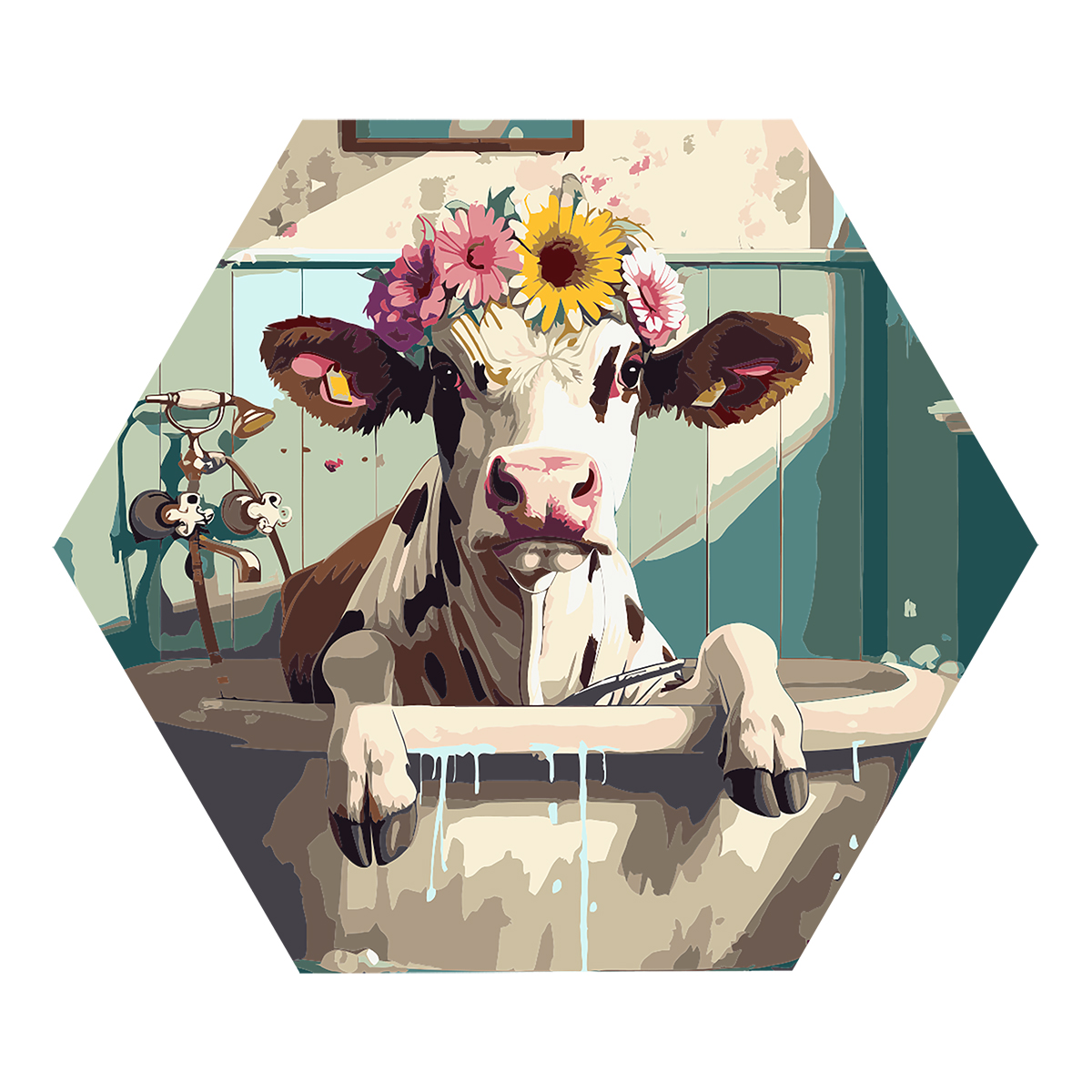 374439 Картина по номерам на фигурном холсте ТРИ СОВЫ "Корова с цветами в ванной", форма многоугольник, с акриловыми кра...