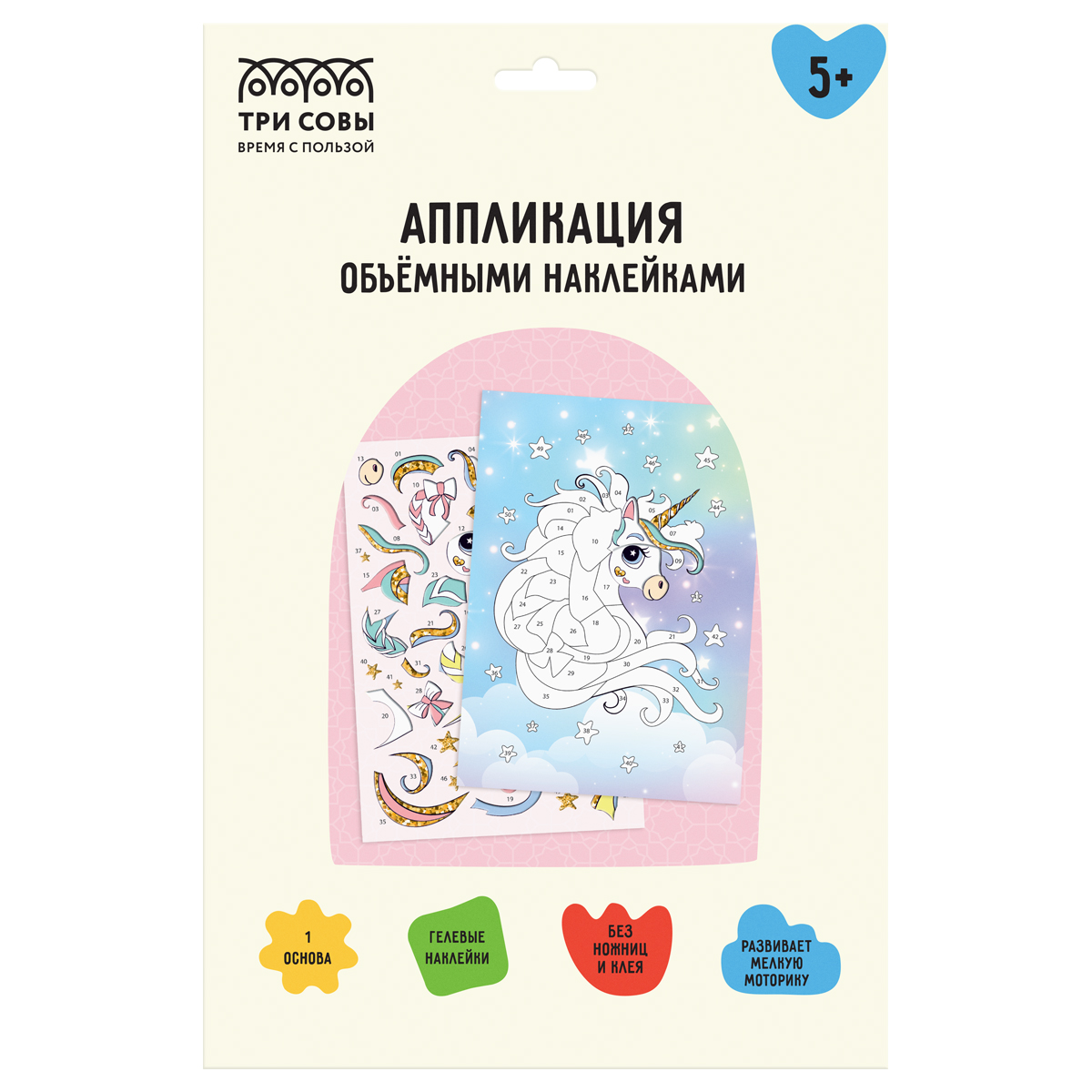 378015 Аппликация наклейками ТРИ СОВЫ "Единорог", А4, 1 основа, объемные наклейки, картонный конверт