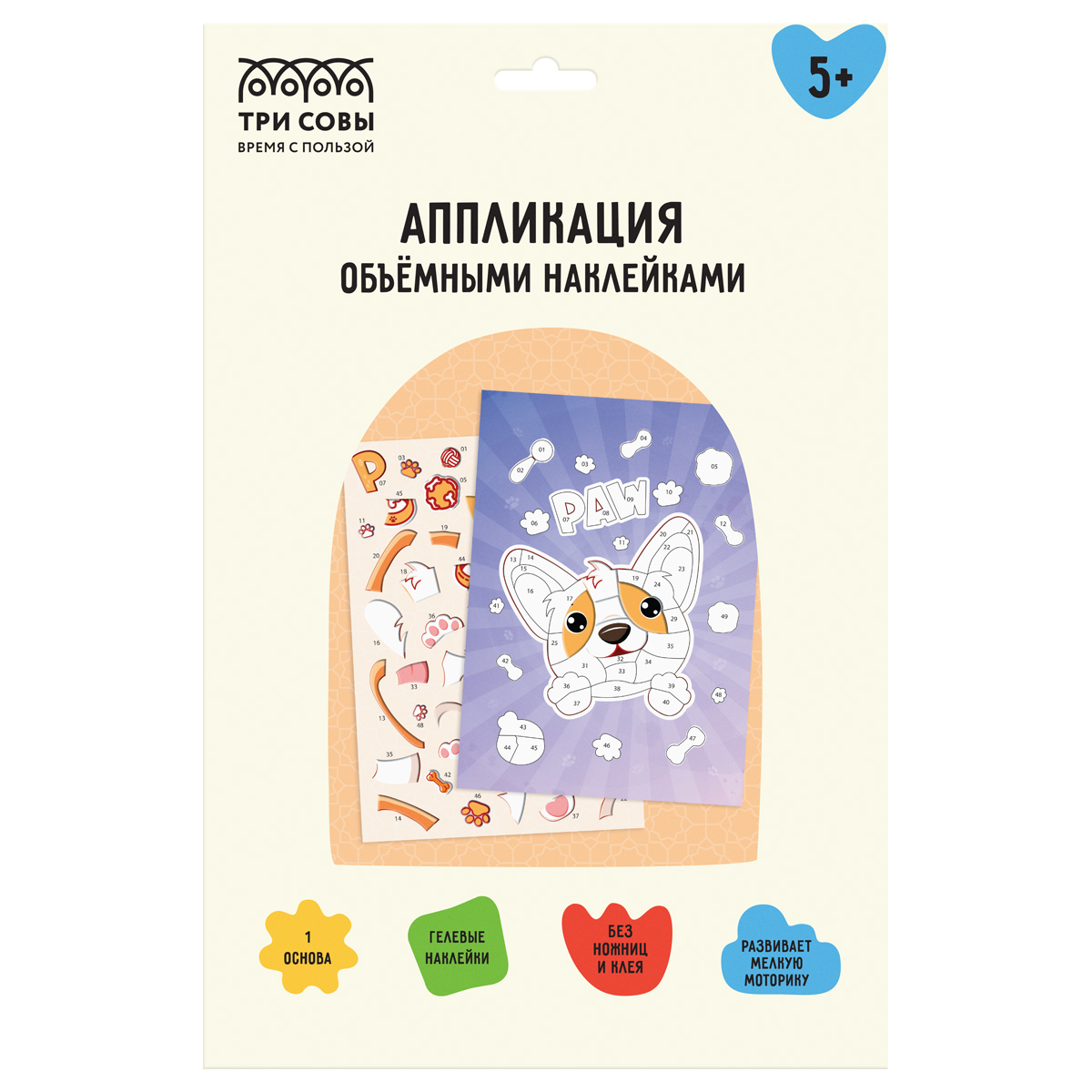 378016 Аппликация наклейками ТРИ СОВЫ "Корги", А4, 1 основа, объемные наклейки, картонный конверт