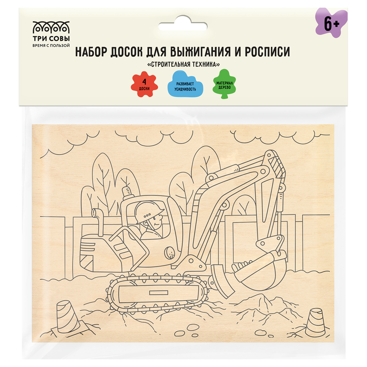 363715 Набор досок для выжигания и росписи по дереву ТРИ СОВЫ "Строительная техника", 4шт., 15*21см, пакет с европодвесо...