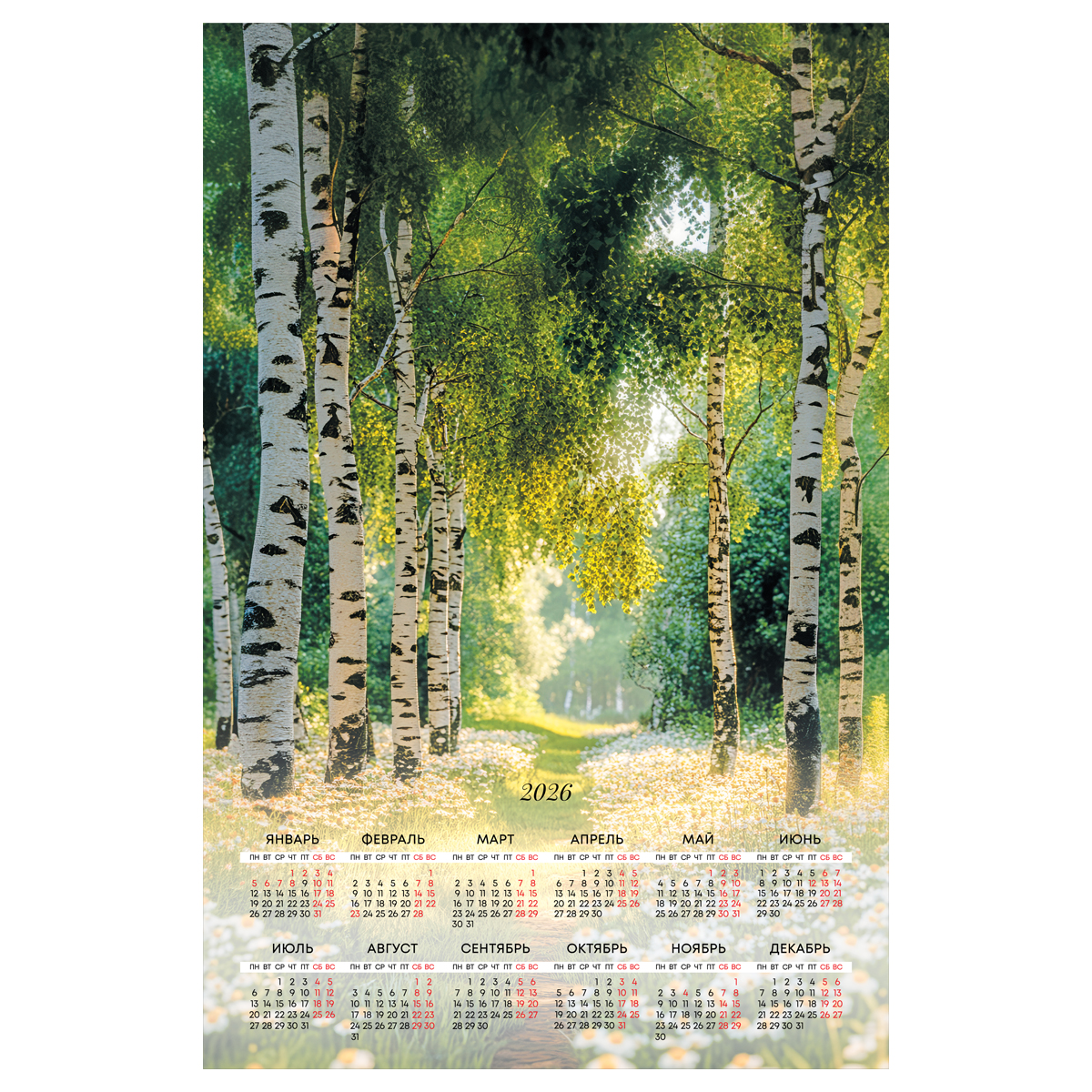 382132 Календарь настенный листовой А1, 590*900 мм BG "Берёзы", 2026г (БиДжи)