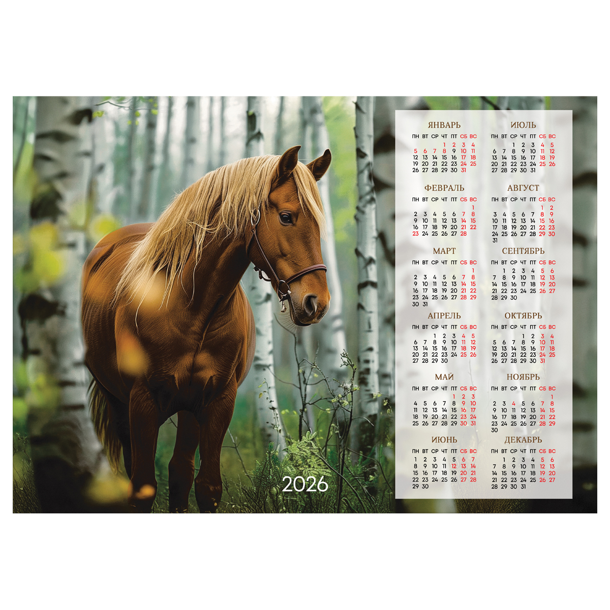 382138 Календарь настенный листовой А3, 300*420 мм BG "Берёзовая роща", 2026г (БиДжи)